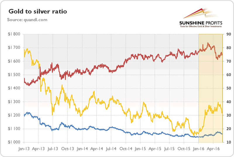 As one can see, the gold-to-silver ratio pushed above 80 in January 2016, reaching a level not seen since 2008. This may signal that gold and silver may begin a new bull market (it, however, doesn’t rule out another big drop in prices, before an expected bull market would begin). It goes without saying that the peak in the ratio may also indicate a recession (just like in 2008) or at least an important economic slowdown. When the economy is slowing down, the industrial demand for silver suffers, while the price of gold is supported by the safe-haven bids. However, the ratio started to decline in April. The drop from the peak came because of an increase in silver prices in April. Silver underperformed gold in the first quarter of 2016, but it accelerated in April. Indeed, the decline in the ratio indicated that silver was rising faster than gold. However, in May the ratio rebounded, as silver decreased more than gold. Despite the recent decline, the ratio is still at relatively elevated level.