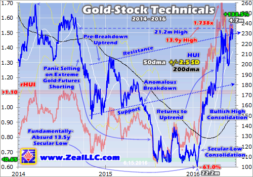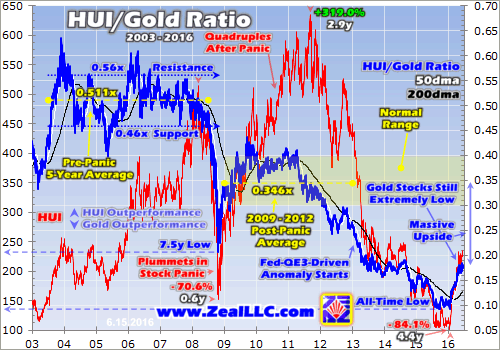 Gold stocks are ultimately leveraged plays on the price of gold. Since their mining costs are largely fixed during mine-planning stages, gold-price increases translate directly into higher profits. These profits rise far faster than gold prices, as I explained in a recent essay on gold miners’ Q1’16 fundamentals. The HUI/Gold Ratio is a quick proxy to distill down gold stocks’ crucial fundamental relationship with gold.