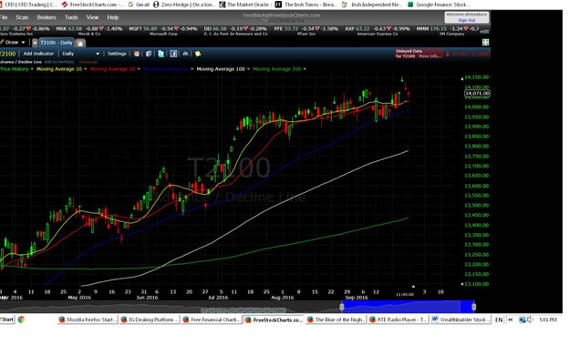 Dow Theory wise there is now significant divergence between the Dow Industrials and the Dow Transports. This means market risk is rising and the internal strength of price action is quickly weakening. Therefore the risk/reward ratio is not sufficient to justify large fund placement. Thus for the moment, investment wise, I would wait and see how things play out this earnings season. A correction would be good. However trading wise I will be very much in place, November 8th, with all guns blazing. Will Donald “Trump” the market I wonder?