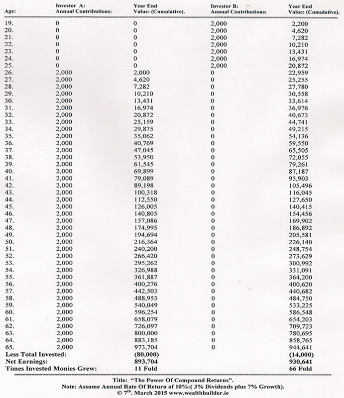 The average “pension investment” cycle is about 40 years (25-65 = 40), therefore if you focus on achieving an annual investment target of 10% you can get 6 “doublings” (approx.) of your investment over the 40 year period. Thus through the “magic” of compounding an “investment pot” of 20,000 Euro or a fund developed through dollar cost average saving (see addendum 3), can grow into a handsome pension fund of 1.24 million Euro after 6 such “doublings”.