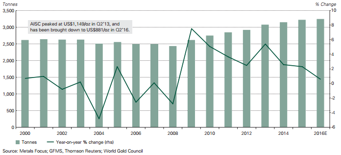 Barrick Gold, the world’s biggest producer, had output of 1.3 million ounces in the second quarter, a drop of 7.5% versus year ago. AngloGold Ashanti, the third-largest miner of the metal, notched a 12% decline in gold production in the first half of 2016.