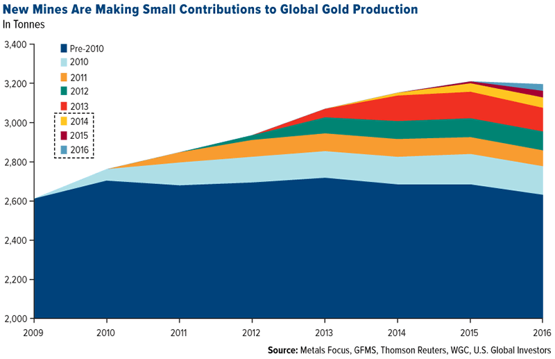 Another important factor is that the new discoveries are not as large or as high grade as they have been in the past. The result is that new mines are making a smaller contribution to global gold production and failing to replace the quantity or quality of previously discovered mines.