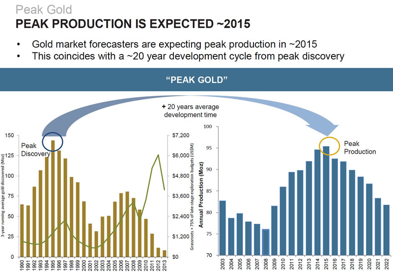 Mark Bristow, CEO of Rangold Resources: Peak gold production may be reached within the next three years as miners fail to replace their reserves. World’s gold output could peak as early as 2019.