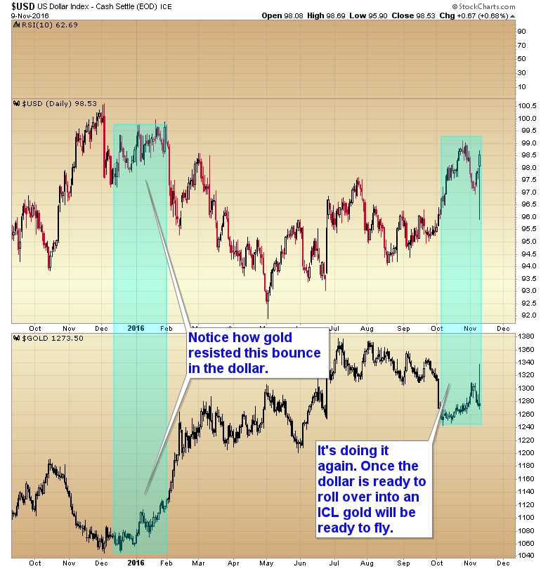 Gold is resisting the bounce in the dollar, as it has done in the past. Once the dollar is ready to roll over into an intermediate cycle low gold will be ready to fly.