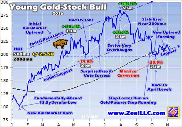 And if gold continues to power higher on balance in the coming years just as it did under Obama’s big deficit spending in the late 2000s, gold stocks will naturally follow it higher and amplify its gains. That’s always the way gold stocks work due to their great inherent profits leverage to gold. The gold stocks were actually faring reasonably well technically Wednesday despite gold’s surprising weakness after Trump’s victory.