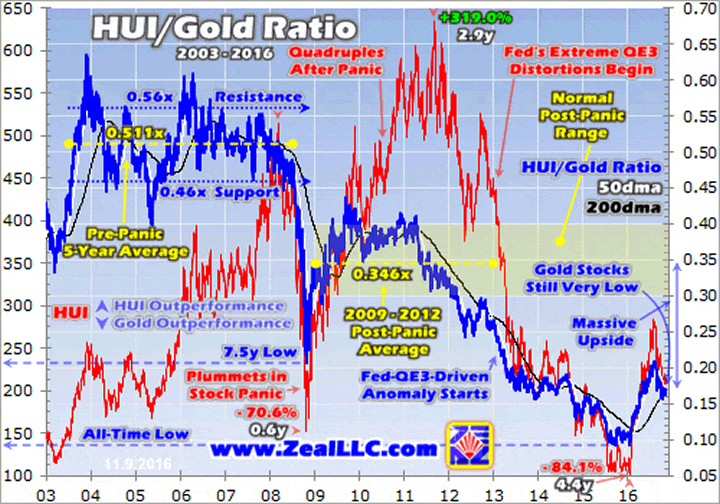 At worst the HGR fell to 0.093x, or the headline HUI gold-stock-index level was just 9.3% of prevailing gold price levels. Smart contrarian traders tough enough to fight prevailing sentiment to buy low then nearly tripled their money by summer, an amazing gain! That left the HGR at 0.209x, still cheap relative to historic precedent. This key fundamental indicator fell to 0.157x in mid-October and 0.162x on election day.