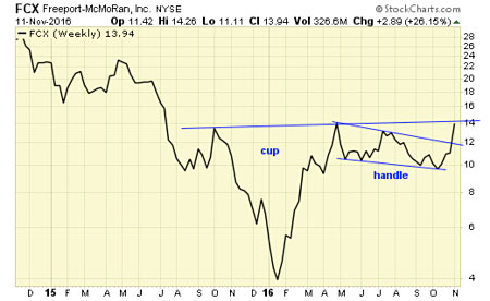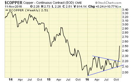 Copper prices broke out this week from the year-long base, as we anticipated.