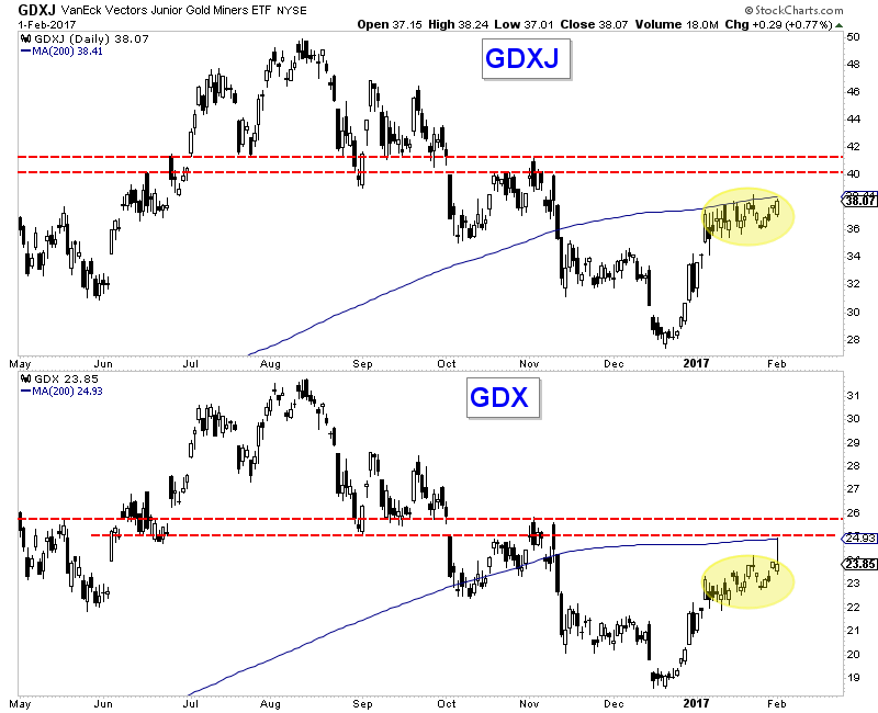 Take a look at a weekly chart and you will notice the significance of those aforementioned targets. The bar weekly charts of GDX and GDXJ are shown below. GDX $26 and GDXJ $41 mark the strongest resistance moving forward. Those levels have been tested 8 times in the past four years compared to the 2013 and 2016 highs which have been tested only 3 times. It’s unlikely the miners break resistance ($26 and $41) on the first try.
