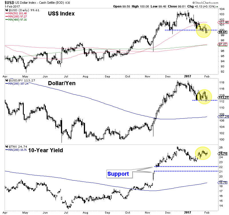 Take a look at the daily candle charts in the image below. We plot the US Dollar index, the Dollar/Yen cross and the 10-year Treasury yield. The US Dollar index has a potential measured downside target of 97 which happens to coincide with a confluence of moving average support. Dollar/Yen has not broken its corrective lows yet but if it does it would strengthen the odds the US Dollar index falls to 97. Meanwhile, the 10-year yield has some more room to fall if its correction were to continue. In short, lower levels on all these charts is short-term bullish for precious metals.