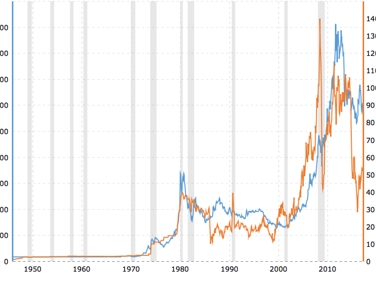 Whilst the jury is still out on the correlation between gold and oil returns, there is some clearer correlation between their prices. It is estimated that over 60% of the time, there is a strong correlation between the two. The above chart compares the month-end LBMA fix gold price with the monthly closing price for West Texas Intermediate (WTI) crude oil since 1946.