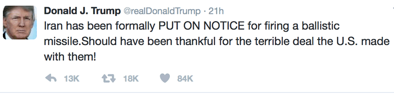 Flynn concluded, “As of today, we are officially putting Iran on notice.” This was followed by a Tweet confirming this position, by Trump.