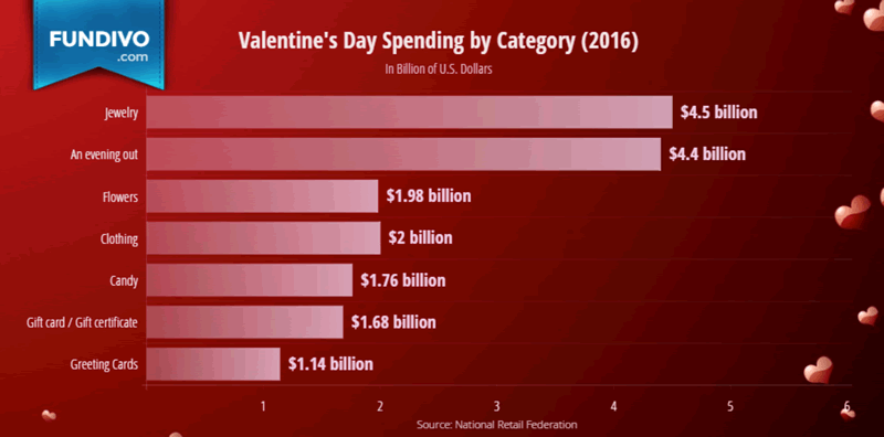 Fundivo.com estimates that $19.7 billion was spent by Americans on Valentine’s Day last year, $4.5 billion of this was on jewellery, the most spend in any category. (Somewhat depressingly $681 million was spent on Valentines for pets).