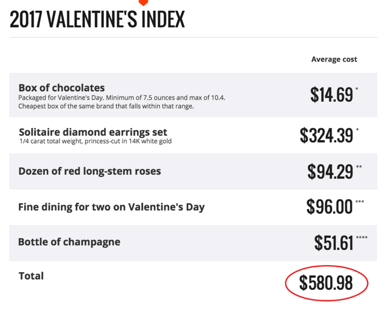 It isn’t so surprising when you look at the climb in prices, year on year. If you want to see a real example of inflation, look no further than the By My Valentine Index created by bankrate.com. It shows that this year the cost of buying a basket of Valentine’s gifts will cost you $580.98. The price has climbed significantly from the 2016 Index of $512.02.