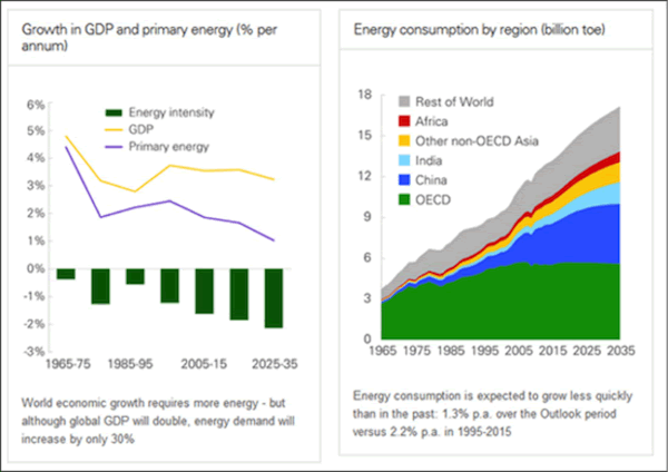 Yes, says the new BP Energy Outlook, an exhaustive report from the former British Petroleum. BP thinks world energy consumption will grow 1.3% per year from 2015 to 2035.