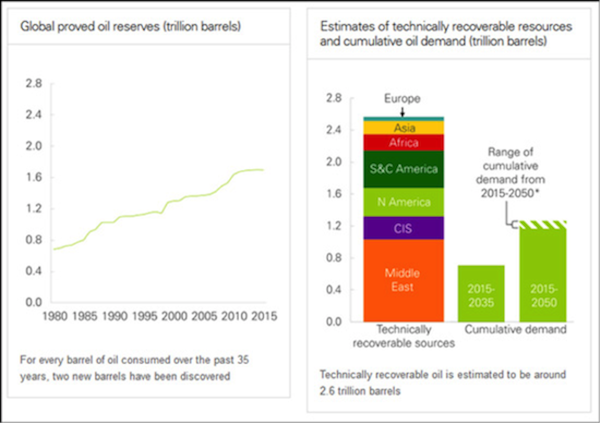 Even if the entire world stopped exploring for oil right now, the amount we’ve already located is more than twice the cumulative projected demand from 2015 to 2050.