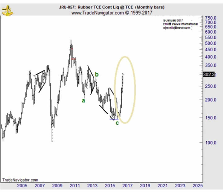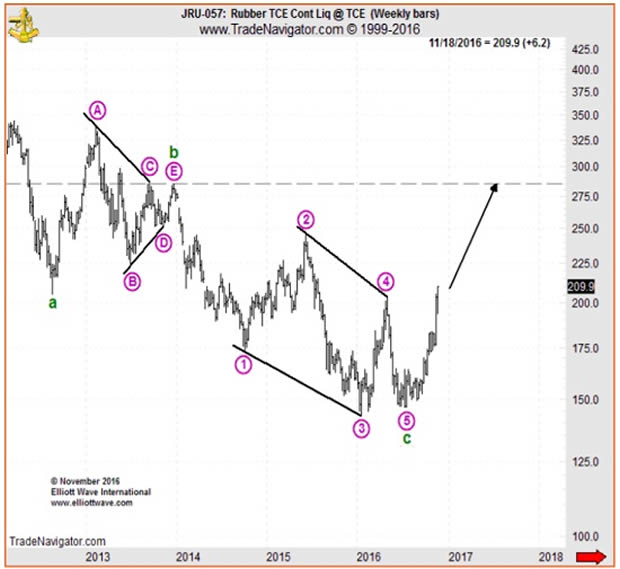 In his November 2016 Monthly Commodity Junctures video episode on rubber, Jeffrey made the case for a post-diagonal thrust UP for the long-suffering rubber market: