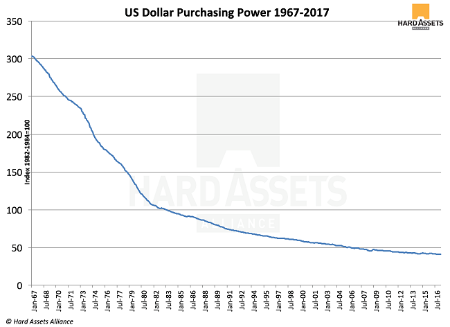 The US dollar may be rising against other currencies like the euro and yen. Nonetheless, in the last 50 years, its purchasing power has fallen by 86%.