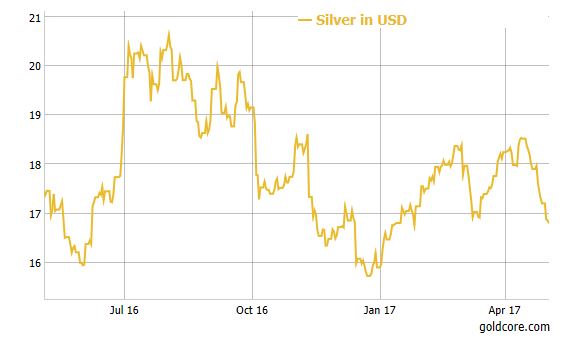 28 Apr: USD 17.41, GBP 13.45 & EUR 15.92 per ounce