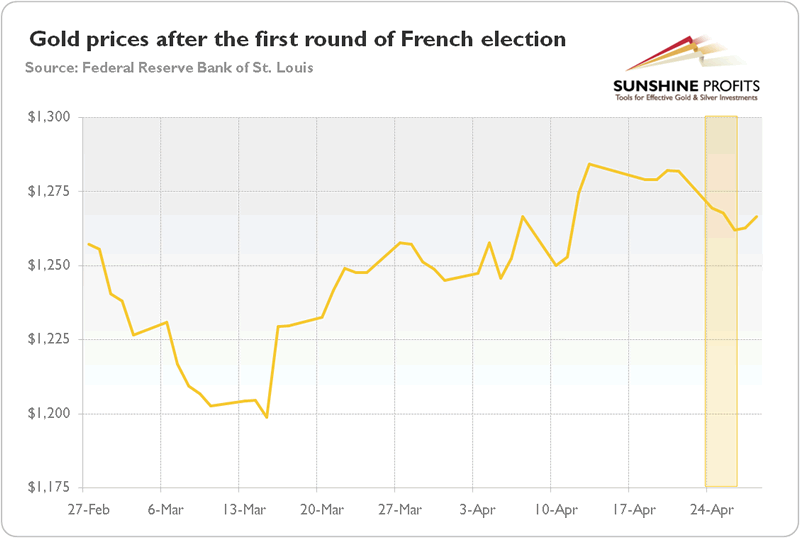 The first round of the French presidential elections is behind us. Now, the main developments in Europe which may affect the gold market – except the turmoil in the still fragile banking sector – are a run-off in France and Brexit. Let’s analyze them and their potential impact on the gold prices.