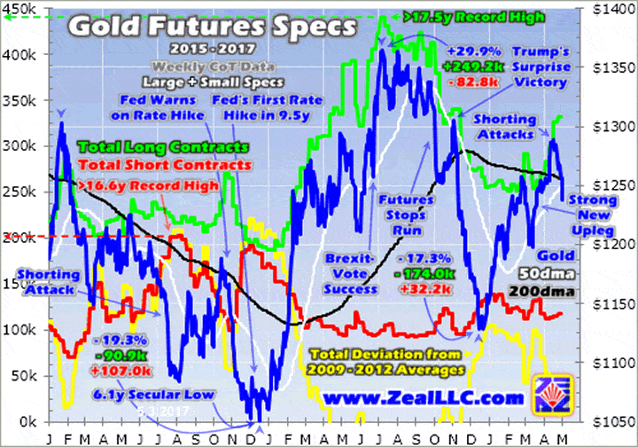With this background, fast forward to April 2017 a couple weeks ago. By mid-month, gold was doing really well. It had surged 7.4% higher in just over 4 weeks since the Fed’s third rate hike of this new cycle which had been irrationally expected to be super-bearish for gold. Then some large speculator or group of them started probing gold’s downside on Tuesday April 18th with the initial gold-futures shorting attack.