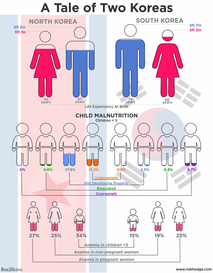 Stunted growth—and other health issues cited in the infographic—begin with poor diet, particularly in the first two years of life. From 1994 to 1998, North Korea endured a devastating famine which led to a literally uncountable number of deaths—estimates range from 240,000 to 3.5 million.