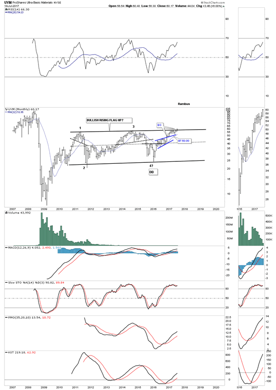 The long term monthly chart for the XLB shows a very similar setup to the long term chart we looked at earlier on the VWO, emerging markets etf. With the expanding triangle we just looked at on the daily chart above breaking out, then the price action should also breakout above the top rail of the 6 year bullish rising flag consolidation pattern.