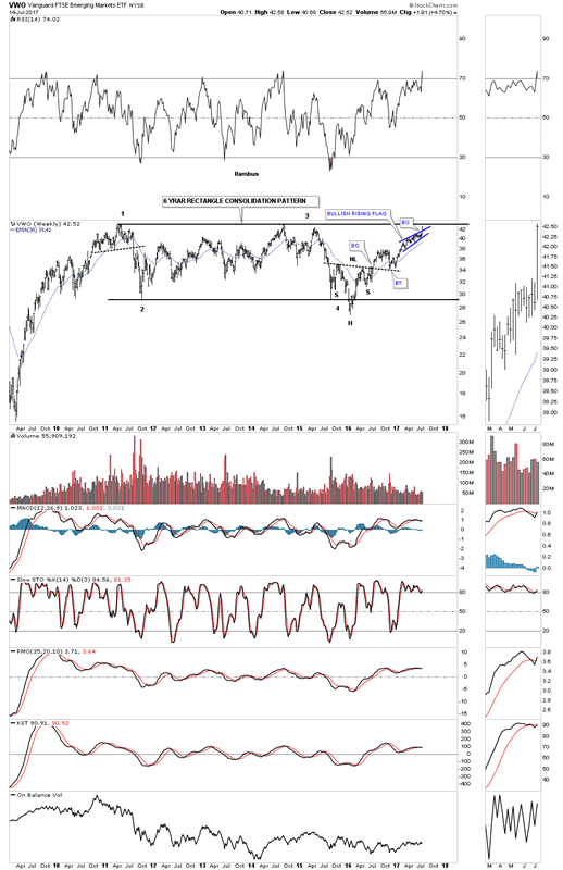 Now I would like to show you the long term weekly chart for the VWO so you can see the 6 year rectangle consolidation pattern that has been building out. Note how the blue bullish rising flag has formed just below that 6 year top rail of the rectangle consolidation pattern. If there was ever a place to see one of these types of bullish patterns buildout this is it.