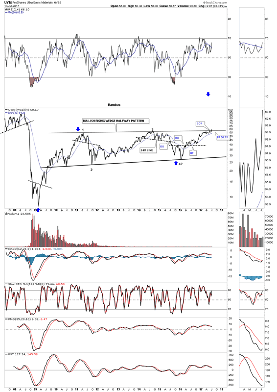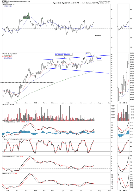 Below is a daily chart for the UYM, 2 X long the basic materials sector, which has just broken out from an almost 6 month expanding triangle consolidation pattern last Friday.