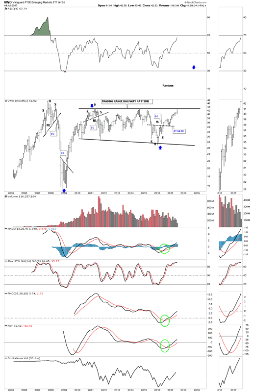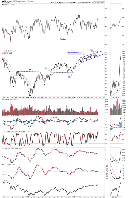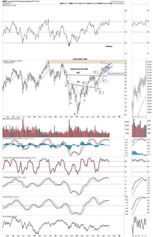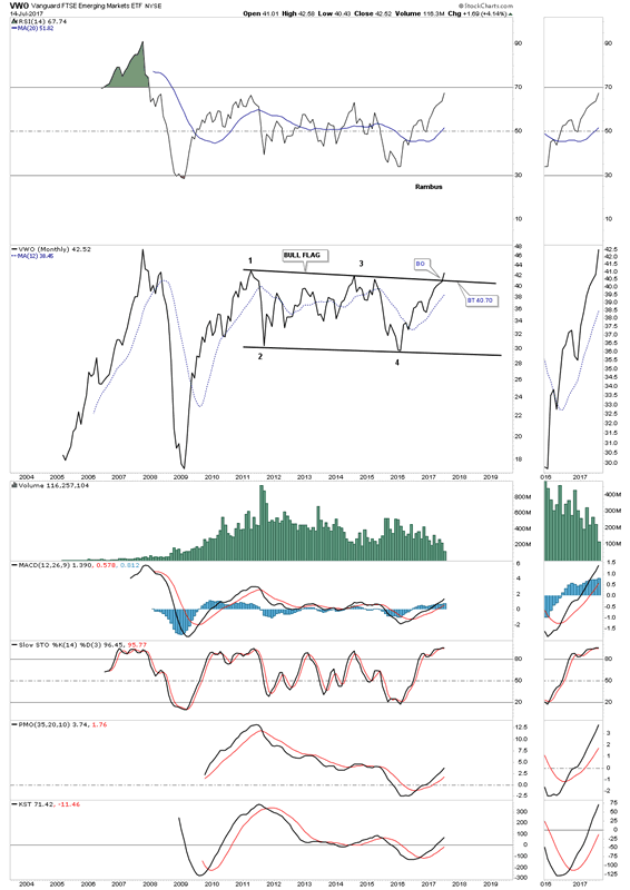 Most like to look at the EEM, emerging market index, but there is another emerging market index which trades with much more volume, VWO which I will use in this post. Lets start with just a simple daily line chart for VWO which shows a H&S bottom in place and a breakout yesterday of the blue bullish rising flag. Keep those two patterns in the back of your mind when we look at the longer term charts.