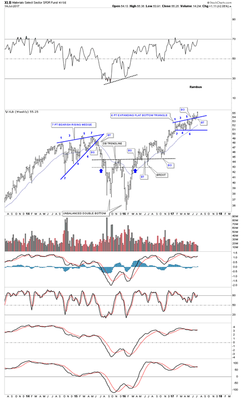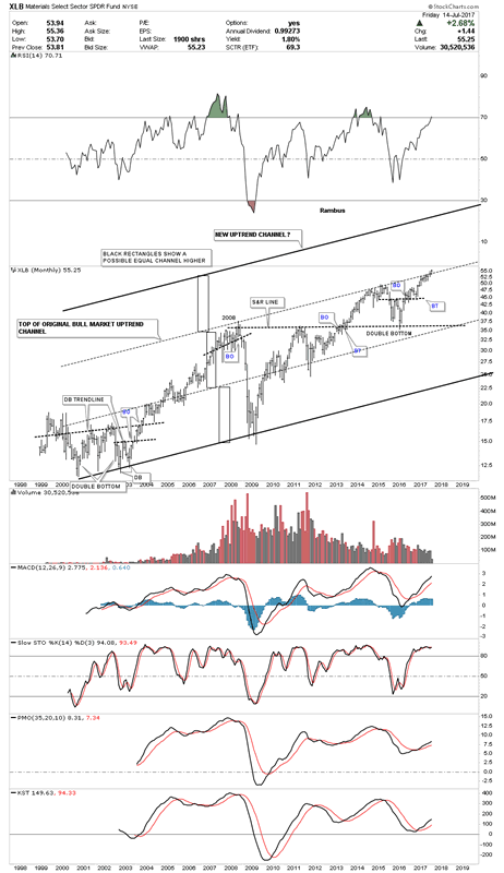 The long term monthly chart for the XLB shows its entire history and its bull market uptrend channel. If the 6 point expanding flat bottom triangle is breaking out topside then the original top rail of the major uptrend channel will be taken out. Generally when that happens you can see another equal channel higher giving the uptrend 3 equal channels instead of two. The black rectangles shows how this new uptrend may play out.