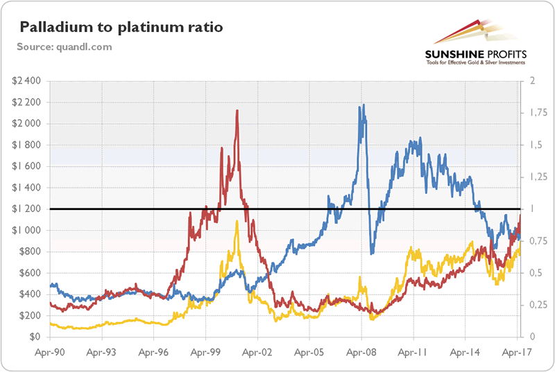 Chart 1: The palladium to platinum ratio (red line, right axis), the price of palladium (yellow line, left axis, P.M. London Fix, weekly average), and the price of platinum (blue line, left axis, P.M. London Fix, weekly average).