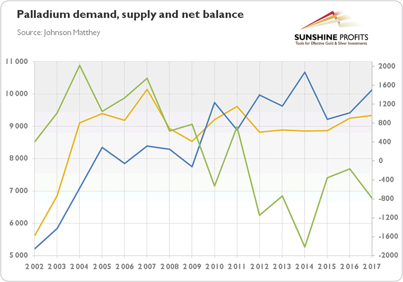 Chart 2: Palladium demand (blue line, left axis, in thousands of ounces), palladium supply (yellow line, left axis, in thousands of ounces), and the net balance (green line, right axis, thousands of ounces) from 2002 to 2017 (the values for 2017 are projected).