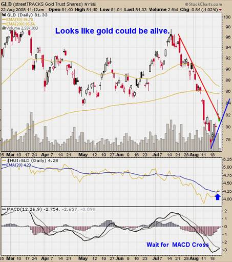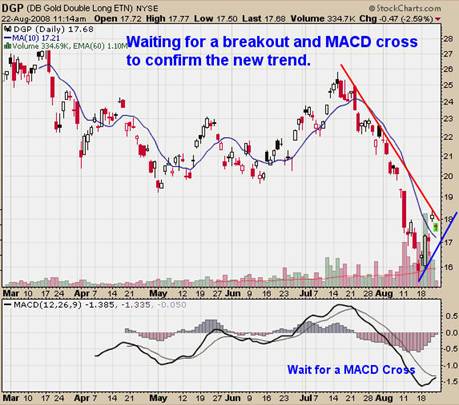 First - My focus is to wait for high probability trades. I do not want to make any more trades than I need to. More Trades = More Risk for my hard earned money. Waiting for a high probability trade is difficult but must be done to generate consistent profits. I wait for gold to find a support or resistance level then look for gold signals in my hand picked collection of gold exchange traded funds like GLD, DGP, GDX and many more…