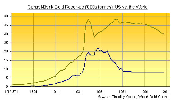 Back to November 1960, meantime, and Secretary of State Christian Anderson had called that White House meeting because government-owned US gold reserves – fixed vs. the Dollar at an unchanging value of $35 per ounce since 1933 – were about to slip below $18 billion "for the first time in many, many years."