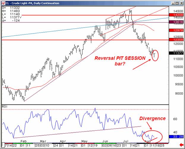 The chart above appeared in the Weekly Maps section last week. The reversal bar on the daily price chart was a big head's up that oil was ready to stretch some resistance to the upside. The divergence in the RSI gave us something to watch for confirmation. As you know, oil rallied strongly over $120 last week. TTC members had existing proprietary targets in gold that helped them take about $10/contract out of the oil market.