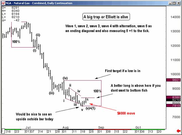 The chart above in natural gas shows a perfect 5-wave down Elliott wave pattern having completed at the end of the previous week. This was yet another suggestion that the move in oil and commodities would be higher last week. When natural gas declined steeply ahead of the Thursday inventory report, the suggestion was put to members to buy calls or go long the futures. This chart, updated to include Friday's action, shows some further support and resistance possibilities from here. TTC traders are more than willing to let the market decide first, after having already captured a $6000 move per option contract off the lows. It remains a mystery how long dead R.N. Elliott knew what the inventory report was going to say. There was a reason that NG stopped exactly where we showed resistance and now members will use the alternate count which is posted in the weekend maps.