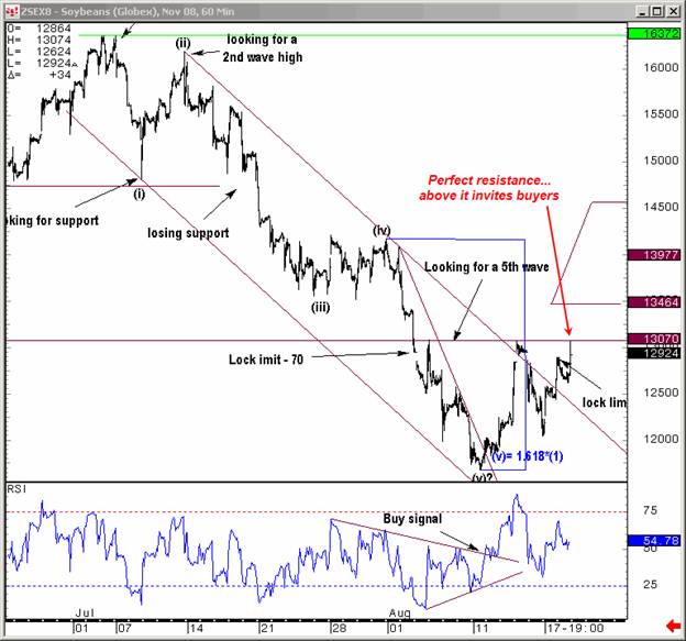 Other commodity markets we've monitored closely over the past few weeks, like gold pictured above, followed suit and played into our reversal expectations nicely. Even soybeans got into the action, trading lock limit up several times off a perfect Elliott wave low before ultimately smacking into perfect resistance.