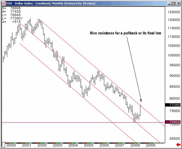 Naturally, a reversal in commodities could reasonably be expected to accompany a similar change in the euro/dollar. Last weekend's Weekly Maps section gave members the Dollar Index chart below, further corroborating our suspicion. But more than a hint at a general change in trend, charts like this one gave members specific areas to watch for key confirmation.