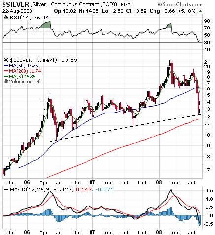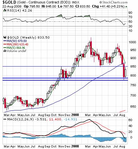 “Bull or bear, call it what you will, the fate of precious metals seems to rest with the U.S. and European economies and the extent to which the monetary base will have to be inflated to prevent a deflationary spiral. The rally off the July 15 lows in stocks has shown the market tends to overreact in these situations. And in this case, the cause for the selloff is rather tenuous at best, and based on some uncertain assumptions.” ~ Precious Points: Bye-bye Bull? August 15, 2008