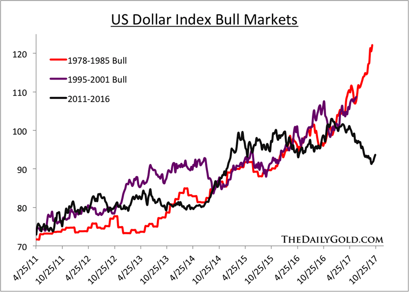 The US Dollar Index (USDI) bottomed in September a hair below 91.00 and has recently rallied up to 94. We were skeptical Gold would break its 2016 highs as it failed to show strong performance in the wake of the USDI’s decline to new lows. The market was discounting a coming rebound in the USDI and/or future weakness in Gold. In any event, although the USDI broke key levels which leave its bull market in question, it became quite oversold and was due for a sustained rebound.