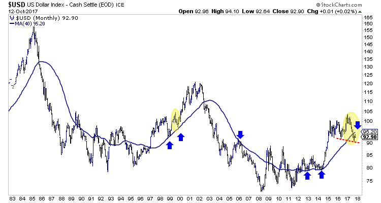 First let’s look at the big picture with a monthly bar chart and the 40-month moving average. As you can see, the 40-month moving average has been an excellent trend indicator and especially since the mid 1990s. The USDI lost that support in July and in addition, made a lower low. Neither happened during the previous two bull markets.