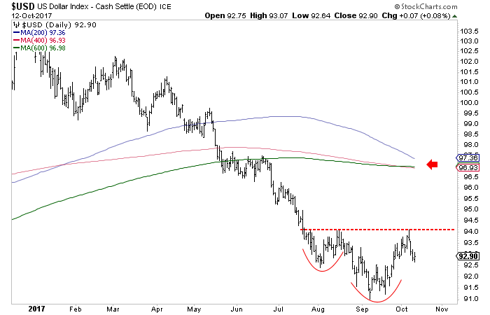While the longer term trend may have turned bearish, the short-term trend may have turned bullish. The USDI could be forming a reverse head and shoulders bottom. On a close above resistance at 94, the USDI has a measured upside target of 97. That target fits very well with the long-term moving averages which are coalescing around 97. (The aforementioned 40-month moving average should reach +96 in the months ahead).