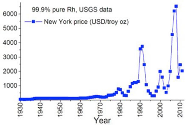 Although rhodium has doubled in the past year, it currently trades just over $1,300.