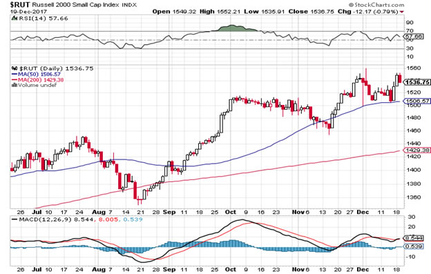 As always with trading and investment decisions one should never become emotional and a good understanding of technical analysis helps one see the wood from the tree and remain grounded. At the outset let me make it clear that from a technical point of view there is no obvious material weakness in this market, even though is very very over-bought. As we speak there have been recent “breakouts” to new highs on the Dow Industrials, the Dow Transports, the S & P 500 and the NASDAQ 100. One major index that I like was showing some weakness, the Russell 2000 small cap, but last week once it reached its 50 Daily Moving Average (DMA) it bounced right back up in concert with all the other indices.
