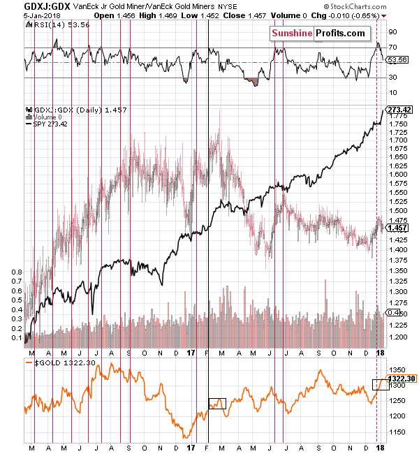 The link between the price of gold and the ratio is far from being clear, which is probably why it’s something that’s under the radar of most investors and analysts. However, the link being unclear doesn’t mean that we can’t use it. Applying the RSI indicator allows us to detect the particularly important price movements.