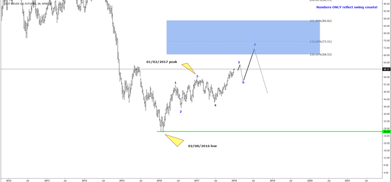 From the 02/08/2016 low, we can clearly see that the market has a potential 5 swing incomplete bullish sequence. It seems like that it is still in the fifth swing. The weekly target for us is between 68.53-86.82. Please note a 5 swing sequence is different than 5 waves impulse. Overall, we can conclude that we need more upside in oil and we suggest members to buy the instrument in 3-7-11 swings to the upside.