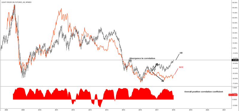 But why do we need the GCC to forecast crude you might ask yourself. Well, that’s pretty easy to answer. Please have a look at the chart below. You can see the crude chart simply overlayed with the GCC index. You can clearly see, that both markets are correlating big time. Obviously, we need to understand that correlation is never pip by pip. This means that we have times where both the markets are diverging to each other. As you can see in in the arrows below. Oil is going higher whereas the GCC made new lows. But that doesn’t change the overall degree of correlation.