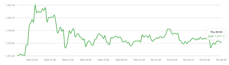 Spot gold prices rose 1.2% from session lows of $1,310/oz to session highs of $1,326.56/oz prior to falling back and closing in New York at $1,317.40/oz where it remains in late morning trading in London.