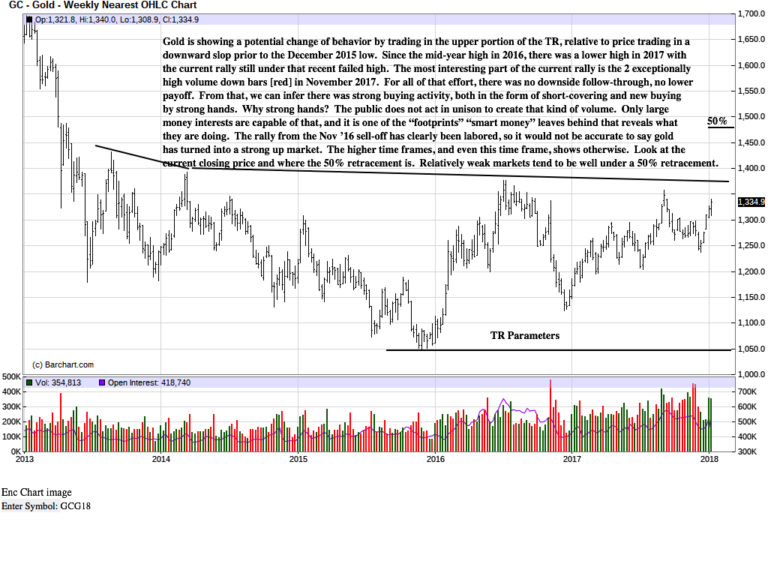 We focused on the two largest volume trading weeks in late 2017, the red bars depicting volume at the bottom. It is only large money interests and those most in a position to know of a shift in price sentiment that can produce such large trading volumes at any point in time. It is impossible for the public to act in unison to create large volumes. Instead, it is the public that reacts to them, almost always to their detriment.