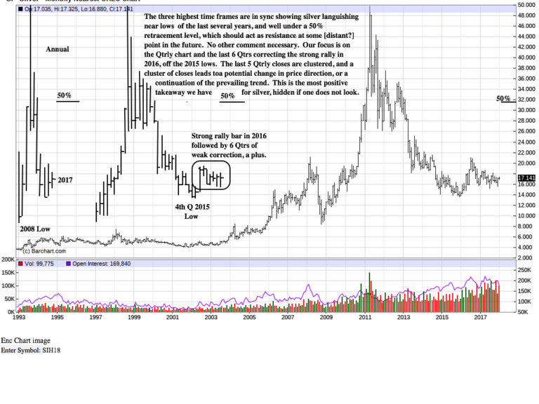 At first, there appeared to be little to say about silver, given its location at/near the bottom of its multi-year TR. We drew attention to the Qrtly chart last October, and we saw even more reason to keep a strong focus on it currently because it appears to be offering some valuable information that is not as apparent on the other time frames.